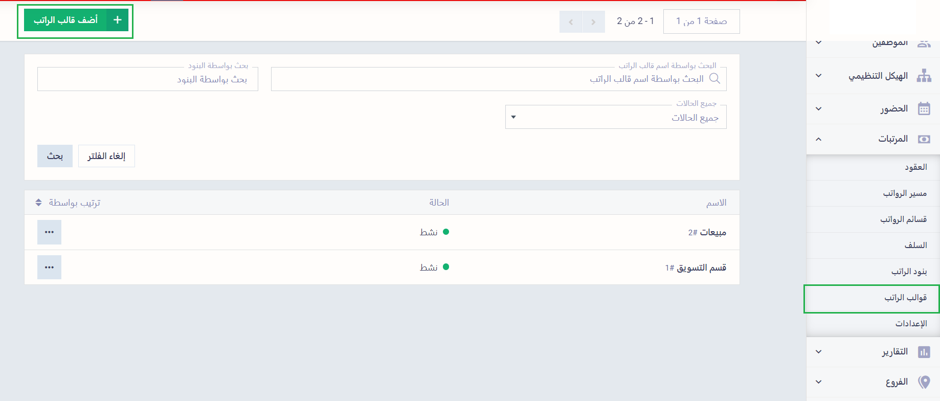 لإضافة قالب راتب اضغط على “قوالب الراتب” المنسدلة عن “المرتبات” بالقائمة الرئيسية ثم اضغط على زر “أضف قالب الراتب”.