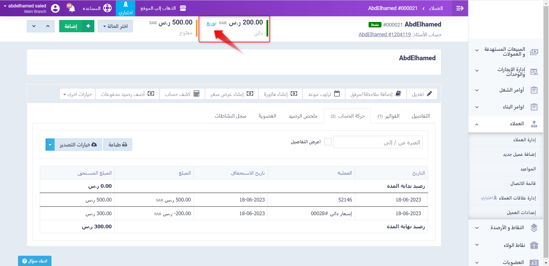 - انقر فوق الرابط “توزيع” الموجود بجوار الرصيد الدائن الخاص بالعميل.