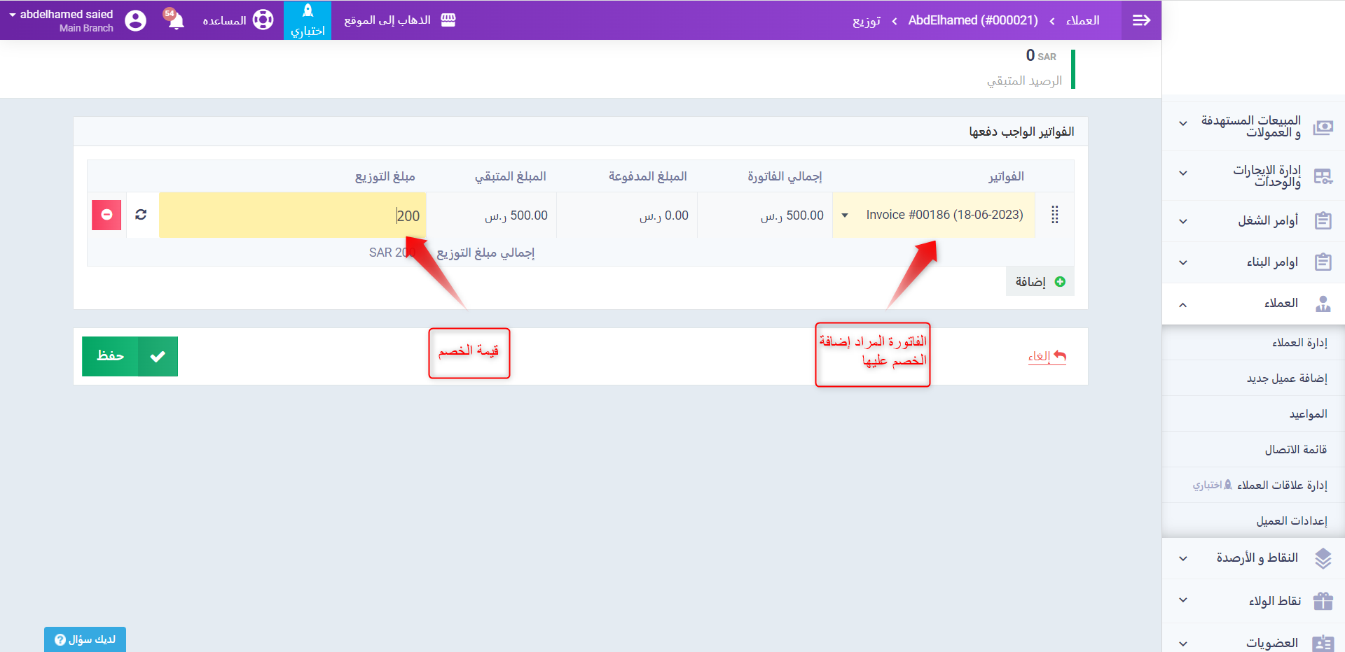 - حدد العميل في خانة “العميل” من قائمة العملاء المسجلين (العميل المراد إضافة خصم له).