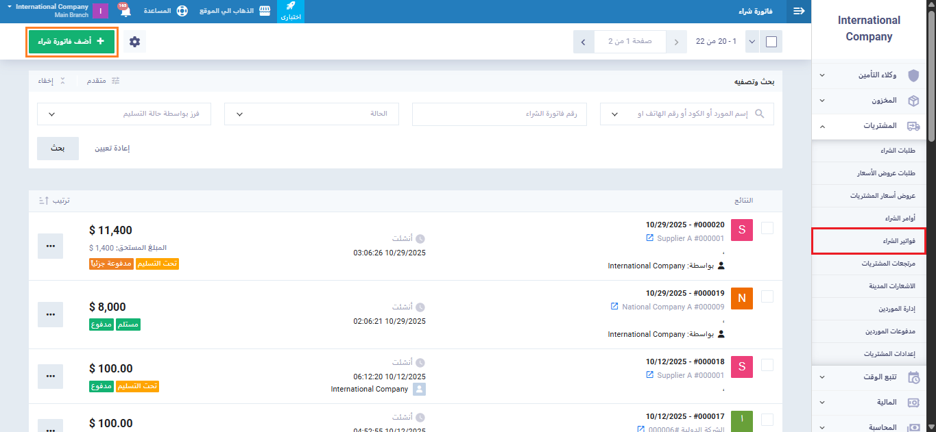 من خلال “فواتير الشراء” المنسدلة عن “المشتريات” بالقائمة الرئيسية يمكنك استعراض قائمة الفواتير كلها، مع إمكانية استخدام فلاتر البحث والحالات المختلفة للوصول إلى الفواتير التي تبحث عنها أسرع ولإلقاء نظرة تحليلية على فئة محددة من فواتيرك، كما يمكنك اتخاذ بعض الإجراءات السريعة أو ترتيب ميعاد أو حذف عدة فواتير معًا، كما يمكنك إنشاء فاتورة جديدة.