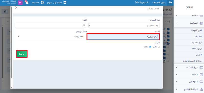 أدخل اسم الحساب الجديد، مثل: “أدوات مكتبية”، واضغط على “حفظ”.