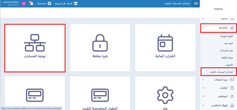 من القائمة الرئيسية، اضغط على “المحاسبة”، ثم اختر “إعدادات الحسابات العامة”، وانتقل إلى “توجيه الحسابات”.