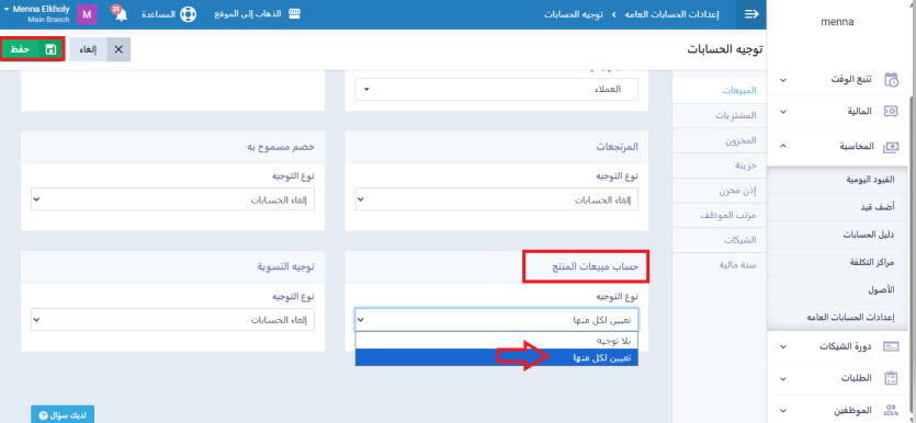 في حقل “حساب مبيعات المنتجات”، حدد خيار “تعيين لكل منها” حتى تتمكن من تحديد حساب مختلف لكل بند في الفاتورة، ثم اضغط على “حفظ”.