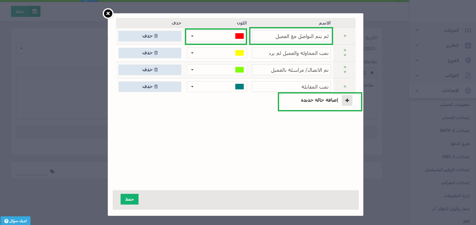 من القوائم المنسدلة اضغط على “تعديل قائمة الإجراءات” أو “تعديل قائمة الحالات”. وقم بإدخال اسم الإجراء أو الحالة، مع تحديد اللون الخاص بكل حالة.