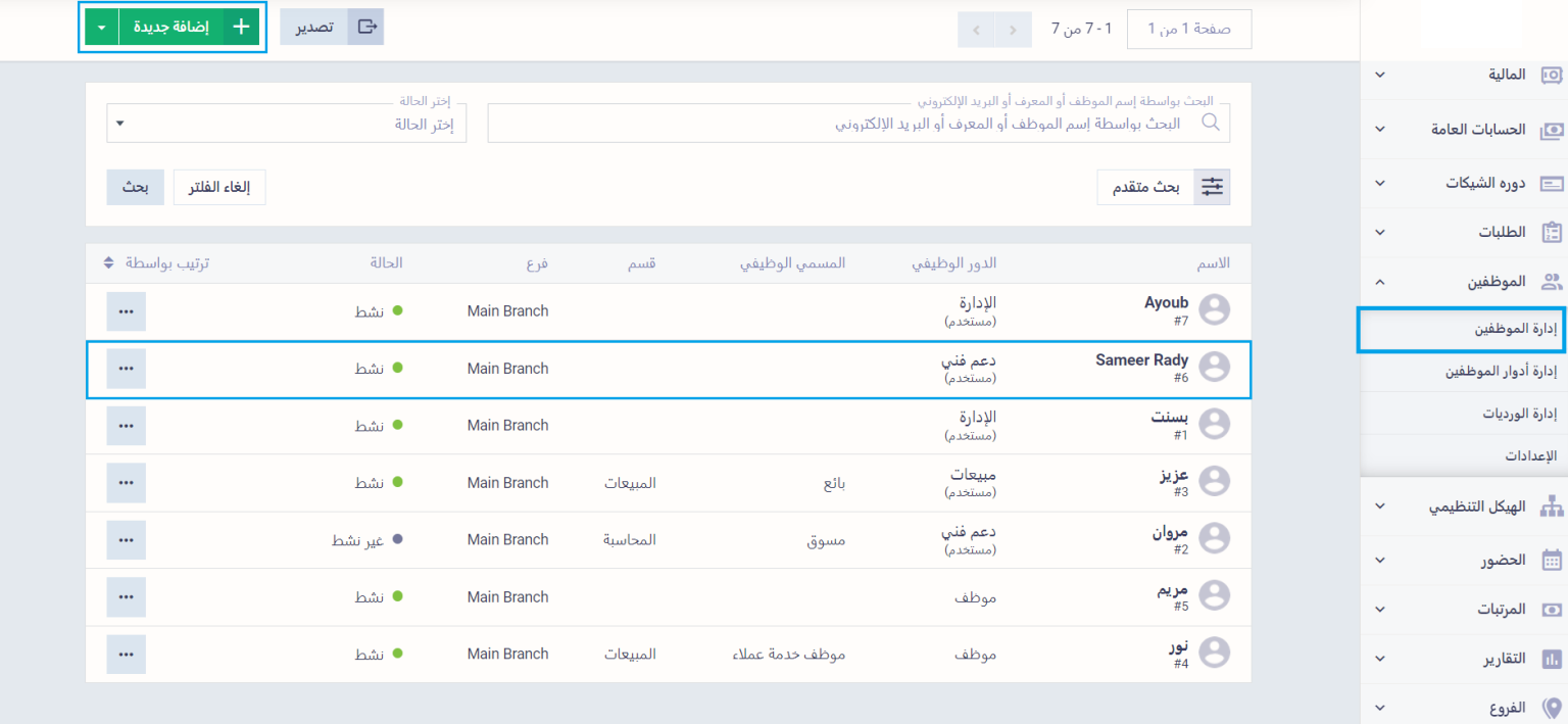 من القائمة الرئيسية، اضغط على “إدارة الموظفين” المنسدلة عن “الموظفين” بالقائمة الرئيسية. واضغط على الملف التعريفي للموظف المطلوب إضافة ملحوظة/ مرفق له.