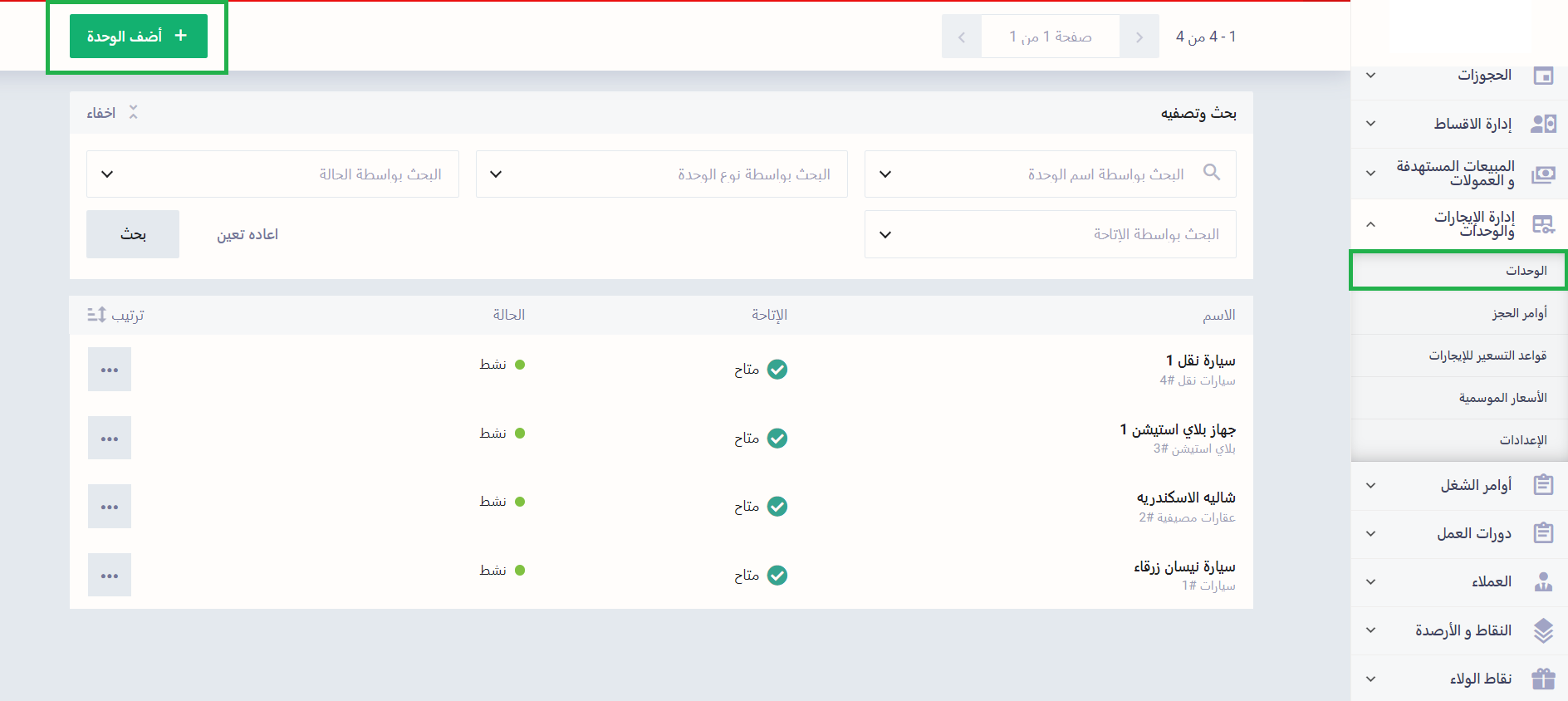 • الحالة: حدد حالة وحدة الإيجار، إما “نشط” بحيث يمكنك استخدامها في أوامر الحجز/ الإيجار أو “غير نشط” لاستبعادها من الاستخدام.