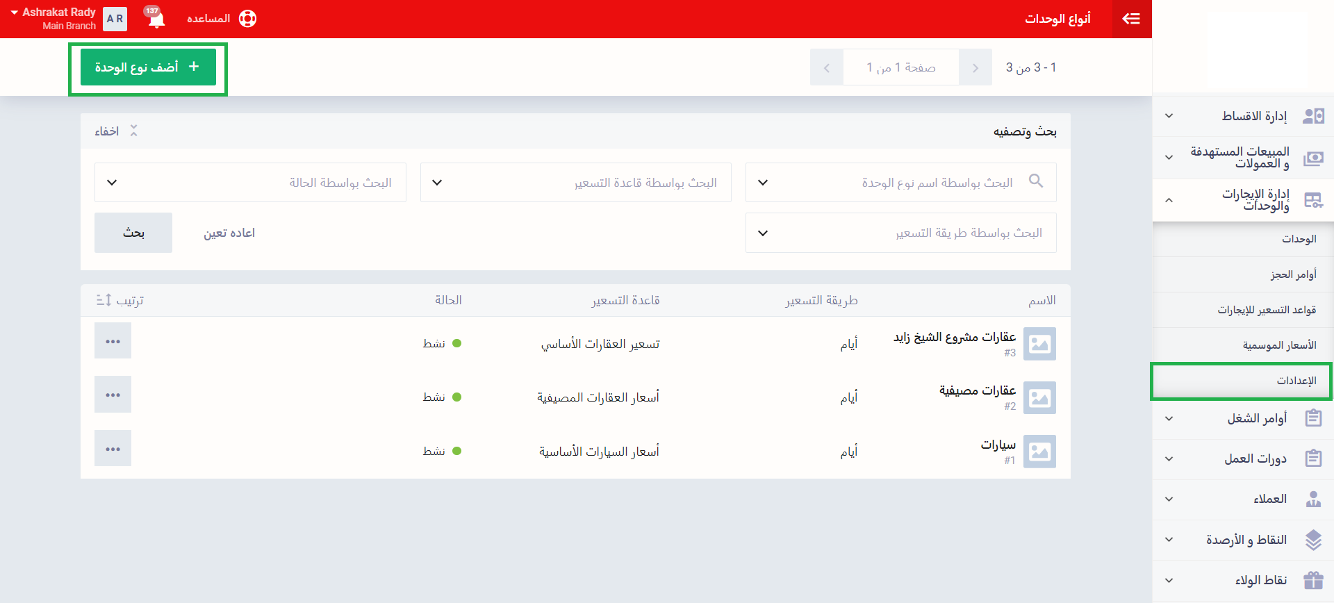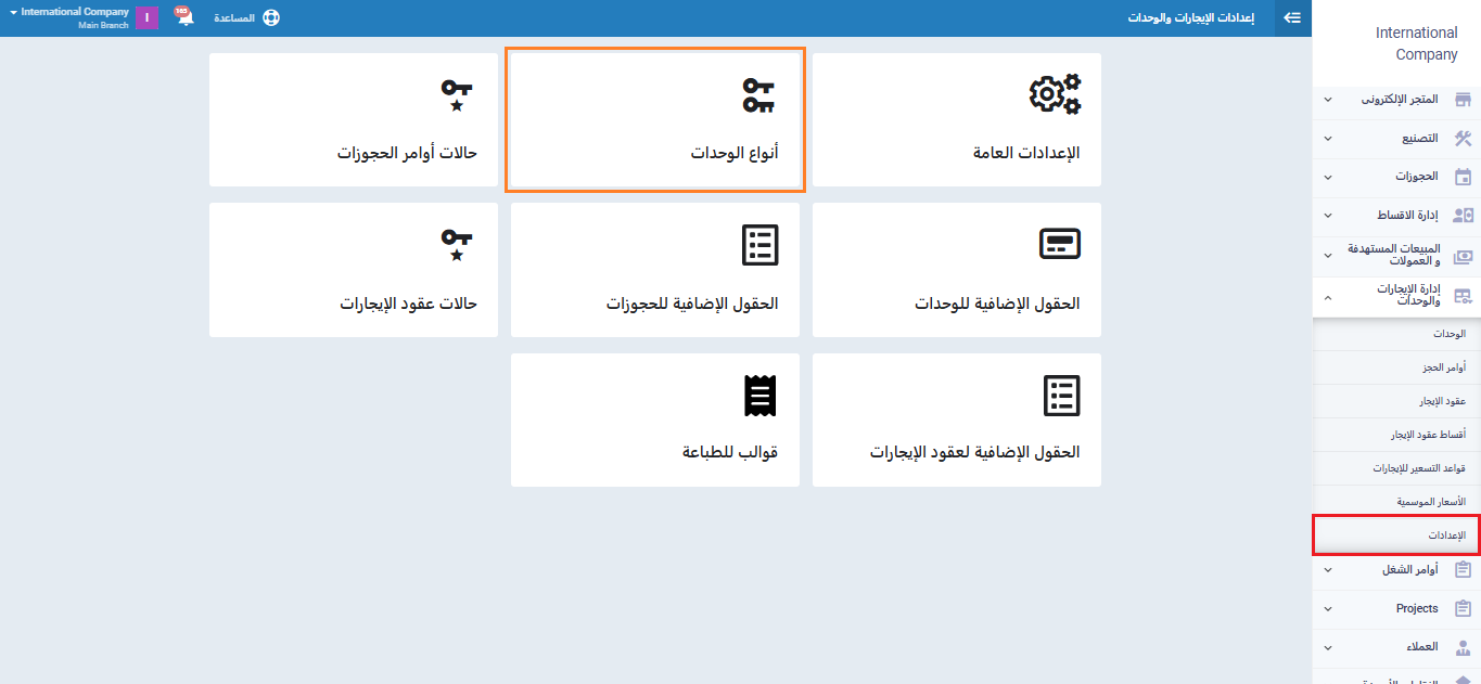 اضغظ على “الإعدادات” المنسدلة عن “إدارة الإيجارات والوحدات” بالقائمة الرئيسية ثم اضغط على بطاقة “أنواع الوحدات”.