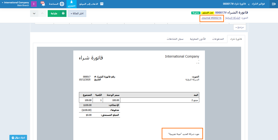 الآن، انتقل إلى قيد الفاتورة من خلال النقر على رقم القيد الموجود في أعلى شاشة الفاتورة، ليتم توجيهك مباشرة إلى تفاصيل القيد المرتبط بها.