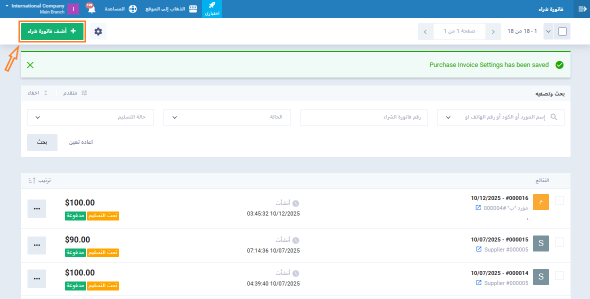 بعد حفظ الإعدادات يوجهك النظام تلقائيا لشاشة فواتير الشراء, اضغط من اعلى الشاشة على زر “أضف فاتورة شراء“.
