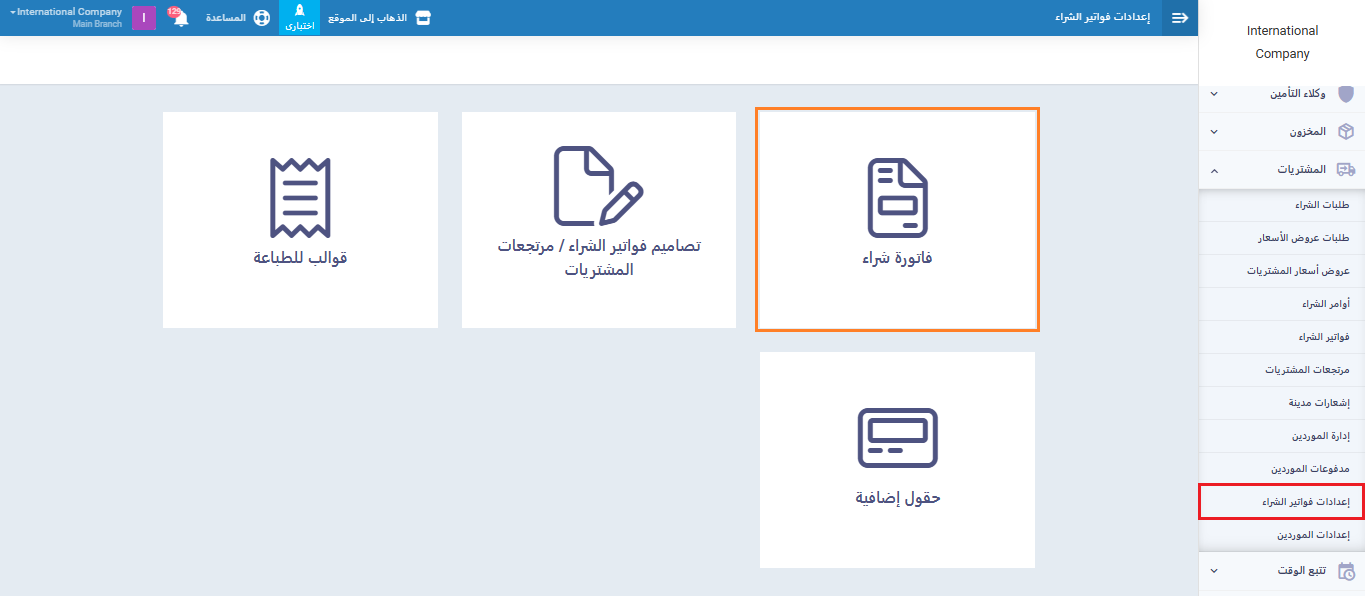 من القائمة الرئيسية اضغط على “المشتريات“, واضغط “إعدادات فواتير الشراء“, ثم اختر”فاتورة شراء“.