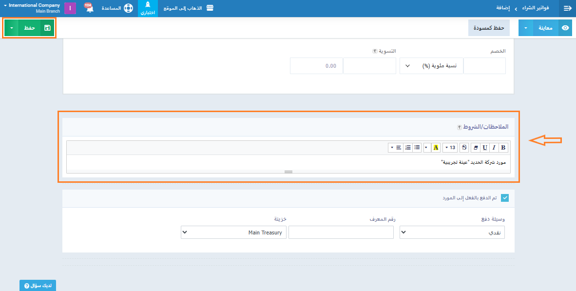 قم بإضافة الملاحظة المطلوبة داخله لتظهر ضمن تفاصيل الفاتورة وفي القيد الخاص بالفاتورة.