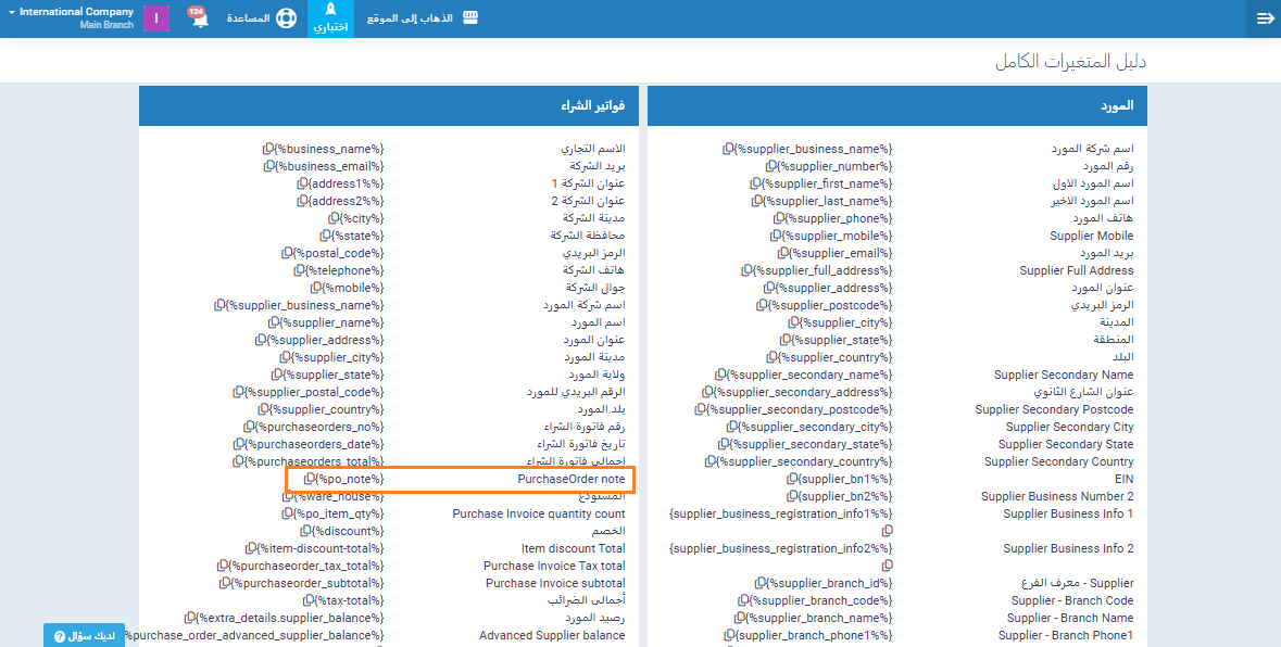من دليل المتغيرات قم بنسخ المتغير “Purchase order note” من قائمة متغيرات المشتريات.