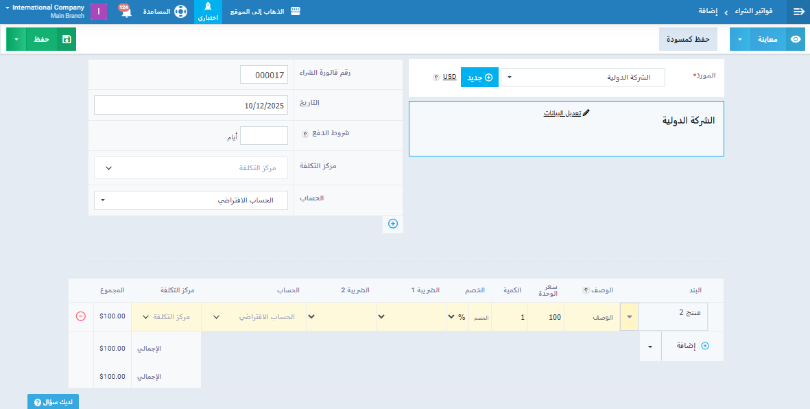 قم بإضافة المورد من القائمة المخصصة، ثم أدخل بنود الفاتورة بما في ذلك الأصناف، الكميات، والأسعار.