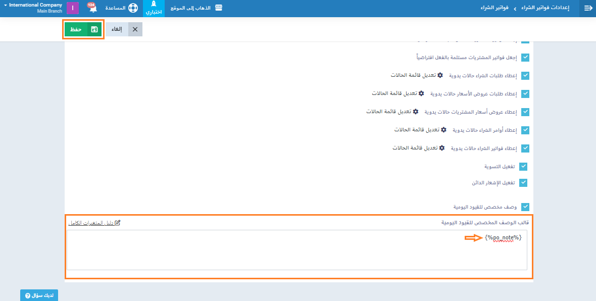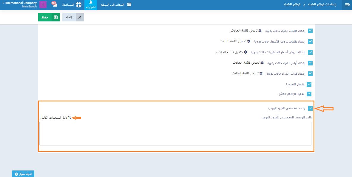 قم بتفعيل إعداد “الوصف المخصص للقيود اليومية”، ثم اضغط على “دليل المتغيرات الكامل” لعرض قائمة المتغيرات واختيار المتغير المطلوب استخدامه.