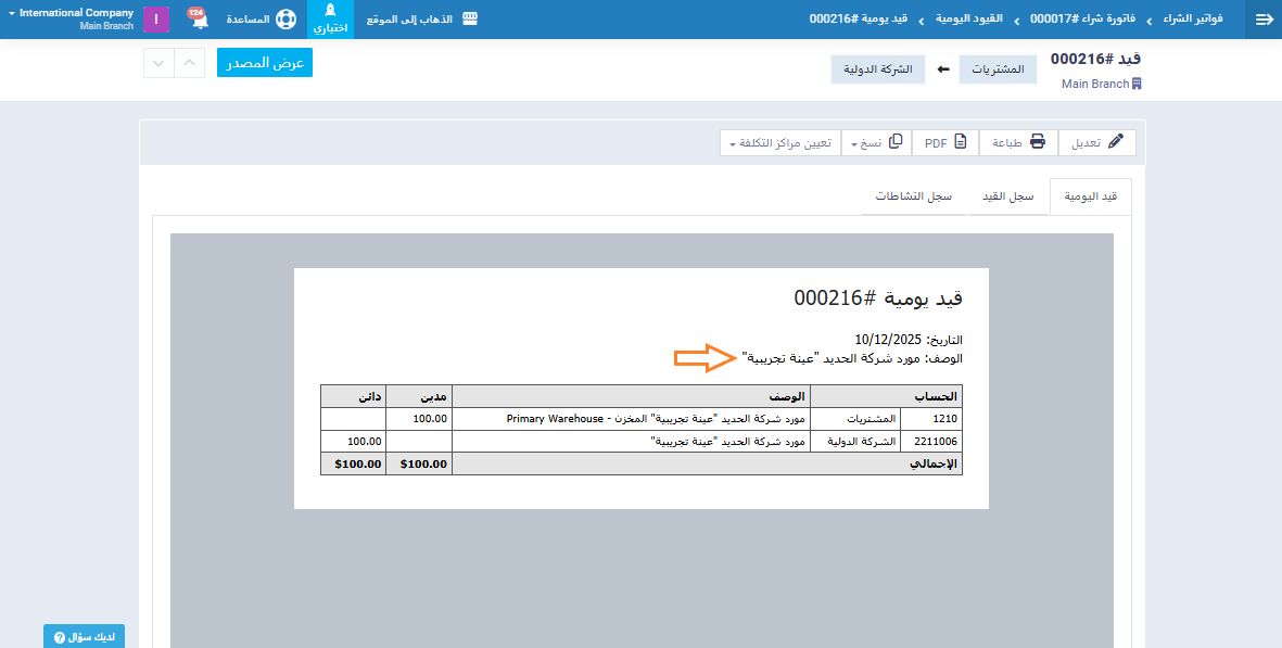 ستلاحظ أن الوصف أو الملاحظة التي تمت إضافتها في الفاتورة تظهر أيضًا داخل القيد.