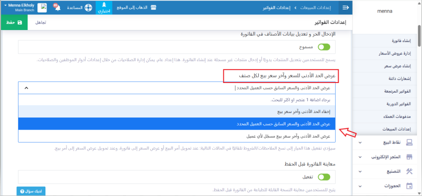 - من خلال حقل “عرض الحد الأدنى للسعر وآخر سعر بيع لكل صنف” قم باختيار الخيار المطلوب كما يلي: