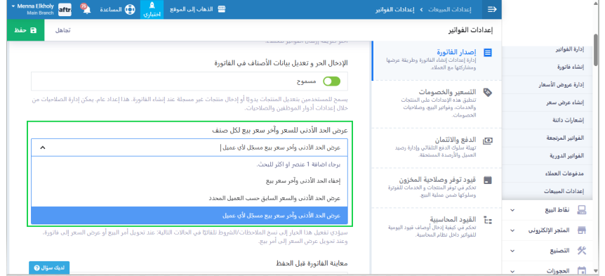 تفعيل إعداد إظهار أخر سعر بيع للمنتج في شاشة إنشاء الفاتورة
