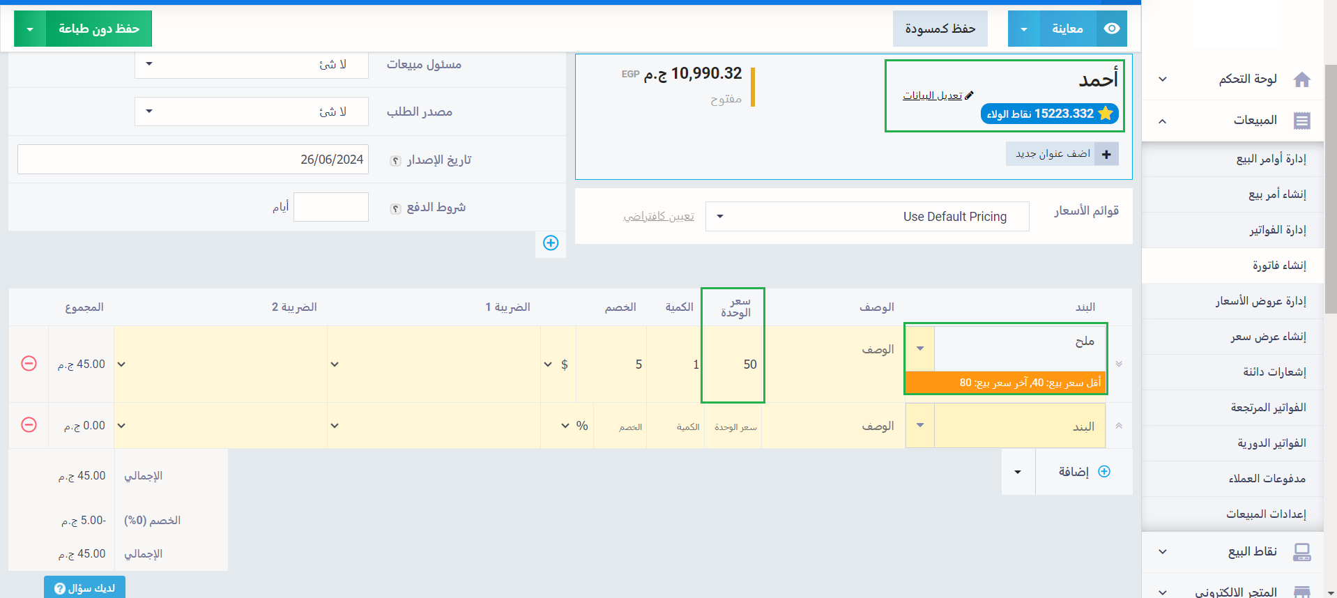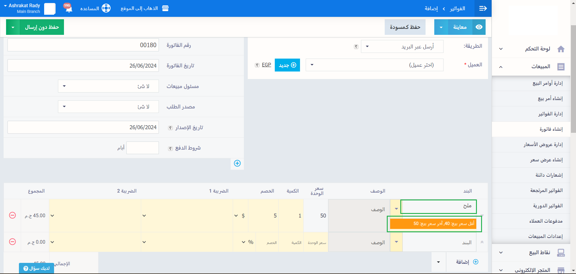 - عرض الحد الأدنى وآخر سعر بيع مسجل لأي عميل: سيقوم النظام بعرض أخر سعر بيع للمنتج أسفل حقل البند في شاشة إنشاء الفاتورة.