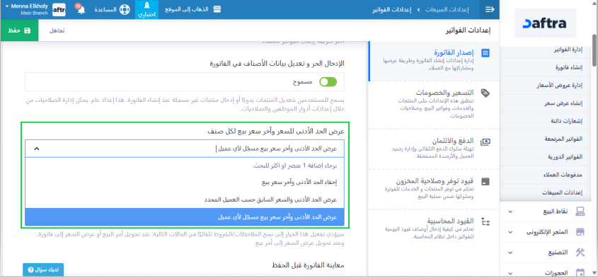تفعيل إعداد إظهار أخر سعر بيع للمنتج في شاشة إنشاء الفاتورة