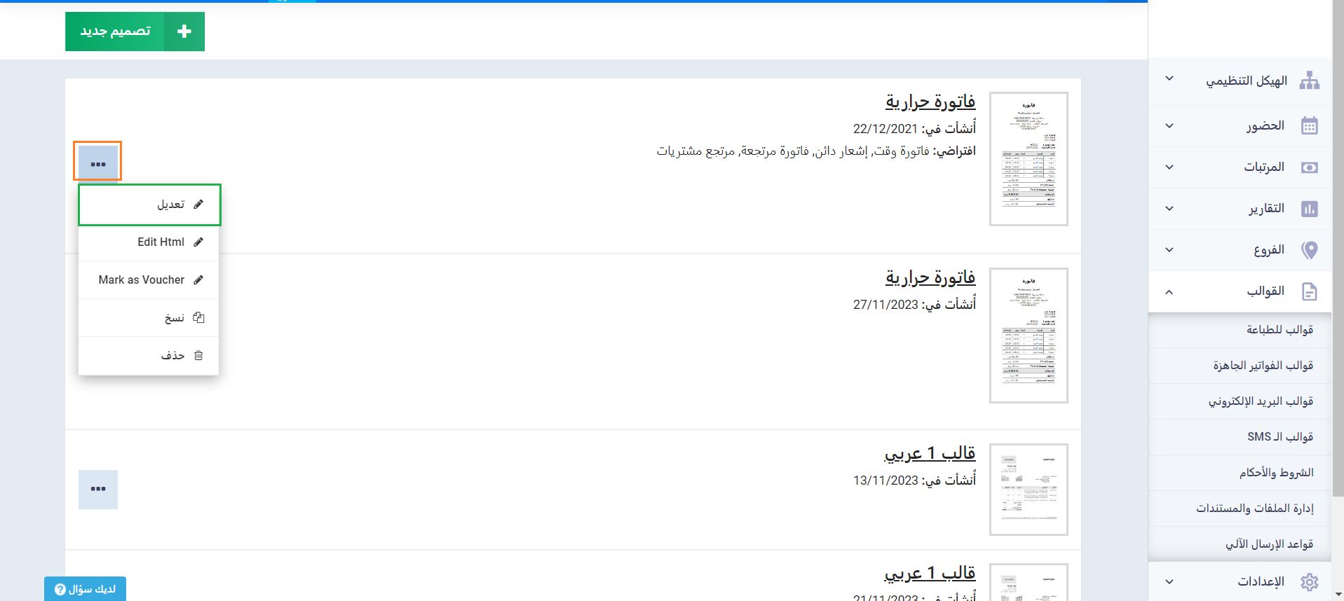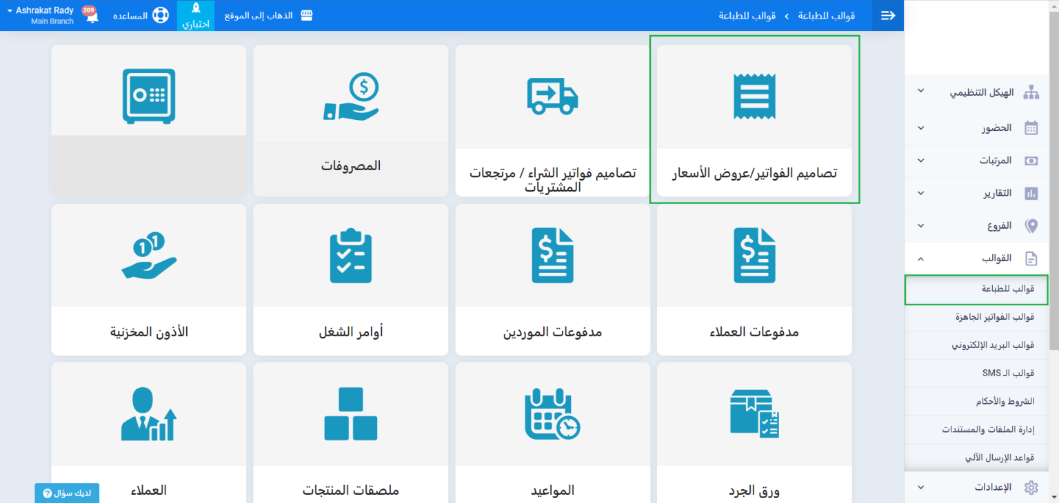للذهاب إلى قوالب الفواتير للتعديل على التصميمات اضغط “قوالب للطباعة” المنسدلة عن “القوالب” بالقائمة الرئيسية ثم اضغط على “تصاميم الفواتير/ عروض الأسعار” أو “تصاميم فواتير الشراء/ مرتجعات المشتريات”.