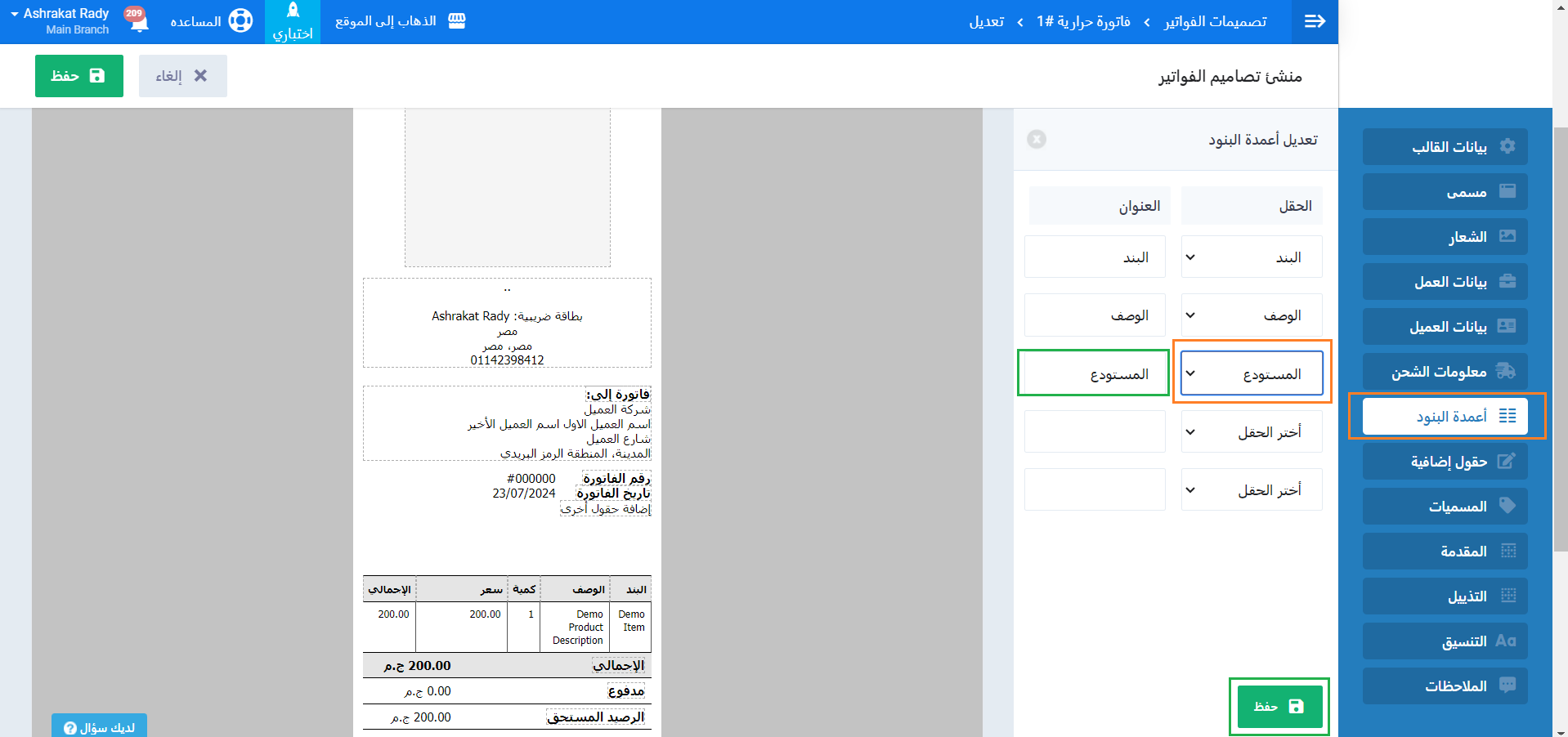 اضغط على “أعمدة البنود” واضغط على القائمة المنسدلة واختر “المستودع” ثم اضغط على زر “حفظ” داخل أعمدة البنود ثم “حفظ” للقالب نفسه.