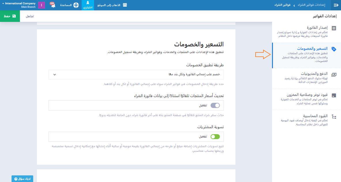 تنقسم إعدادات الفواتير إلى مجموعة من الخيارات التي تتيح لك تخصيص آلية إصدار ومعالجة فواتير الشراء داخل النظام: