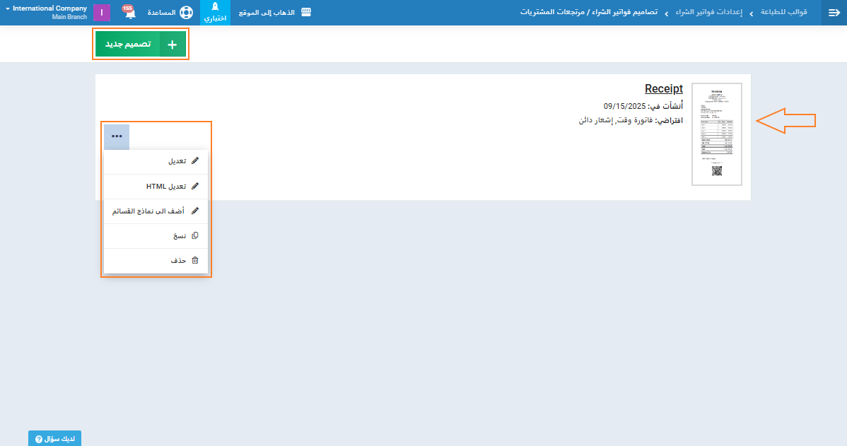 يتيح لك هذا القسم إدارة تصميم الفواتير وأوامر المرتجعات بما يتوافق مع هوية شركتك واحتياجاتها.