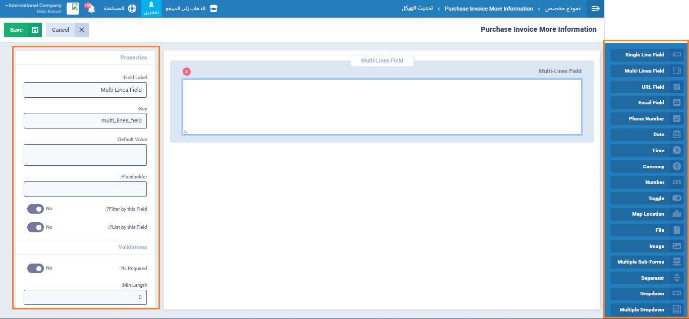 يمكنك من خلال هذا القسم إضافة، تعديل أو حذف حقول مخصصة حسب احتياجات شركتك، مثل بيانات داخلية أو ملاحظات خاصة، لضمان تسجيل كافة المعلومات الضرورية لكل فاتورة بسهولة ودقة.