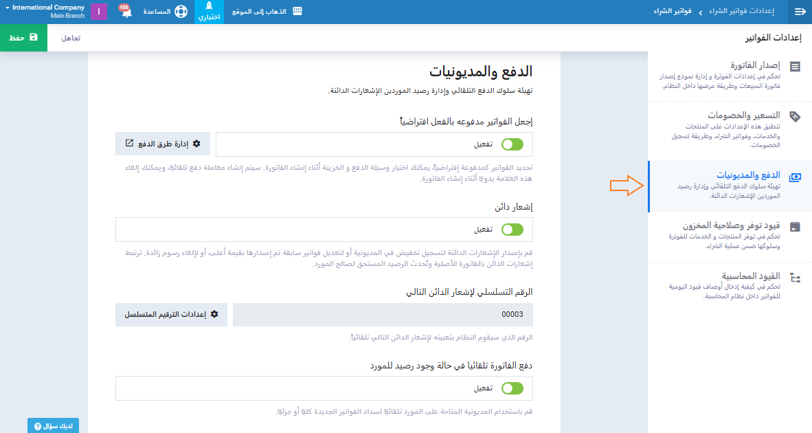 - اجعل الفواتير مدفوعة بالفعل افتراضيًا: لتسجيل فواتير الشراء كمدفوعة تلقائيًا عند إنشائها.