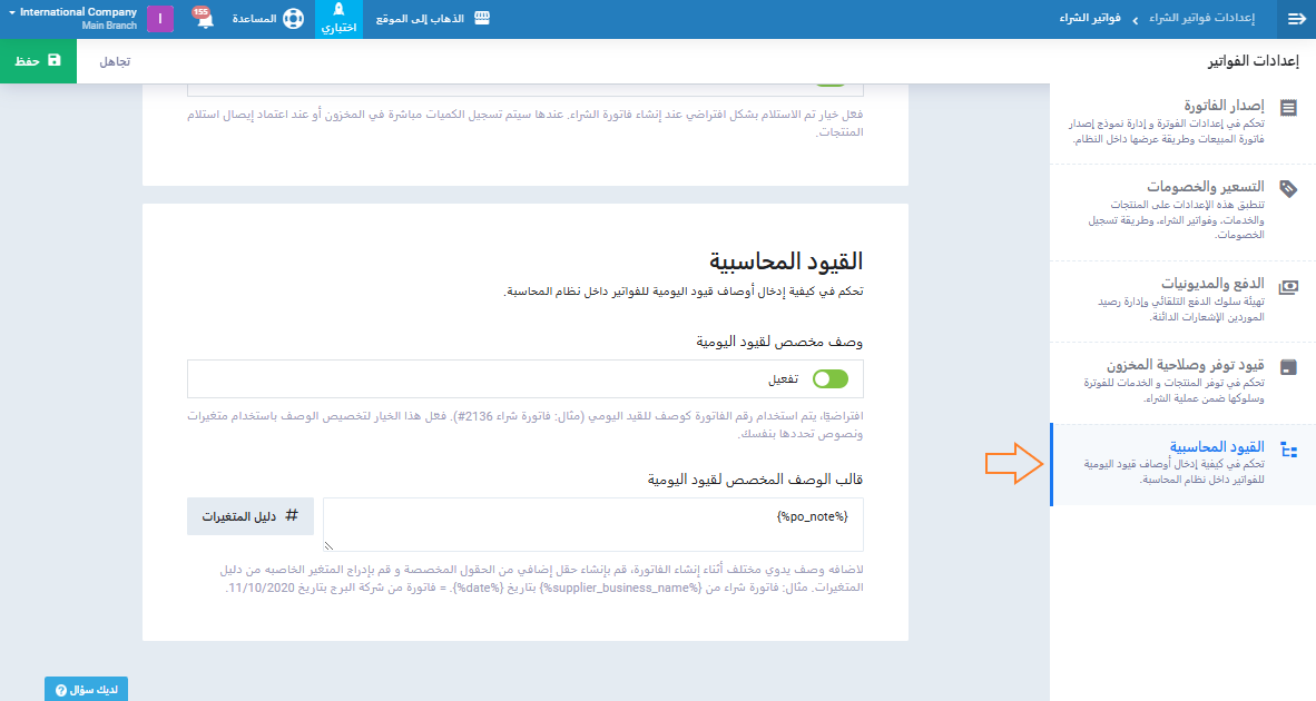 - وصف مخصص لقيود اليومية: تخصيص وصف قيود اليومية الناتجة عن فواتير الشراء.