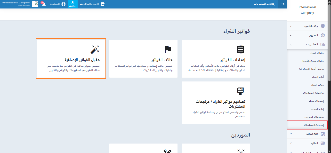 لتخصيص معلومات إضافية في فواتير الشراء، انتقل إلى إعدادات المشتريات ثم اضغط على “حقول الفواتير الإضافية”.