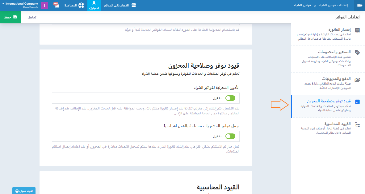 - الأذون المخزنية لفواتير الشراء: يحدد ما إذا كان يتم إنشاء إذن مخزني تلقائيًا مع الفاتورة، مع ضرورة الموافقة لتحديث المخزون أو إضافته مباشرة عند الإيقاف.