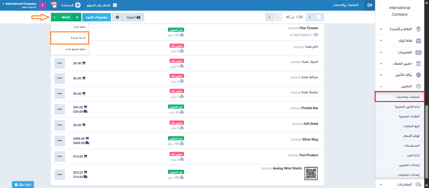 من القائمة الرئيسية اضغط على “المخزون” ثم من القائمة المنسدلة اختر “الخدمات والمنتجات“.