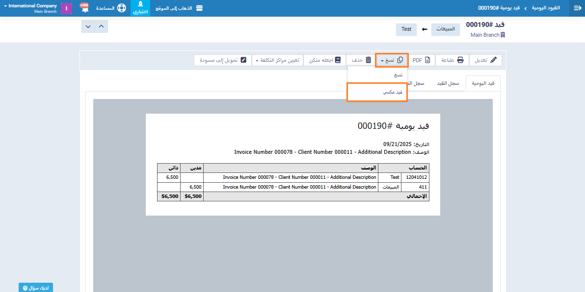 اضغط على زر “نسخ” اعلى بيانات القيد, ثم اضغط على “قيد عكسي“.