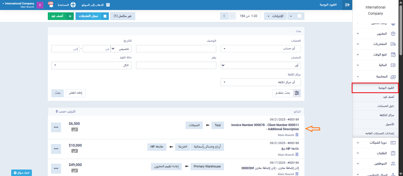 من القائمة الرئيسية اضغط على “المحاسبة“, ثم اضغط “القيود اليومية“, واختر القيد الناتج عن فاتورة بيع الأصل.