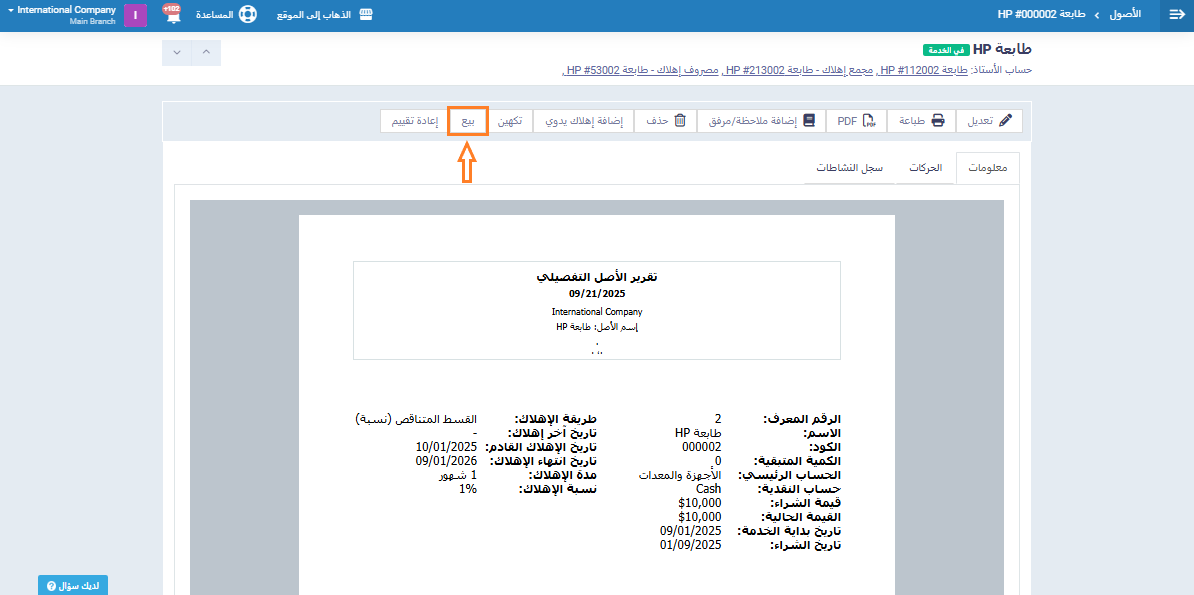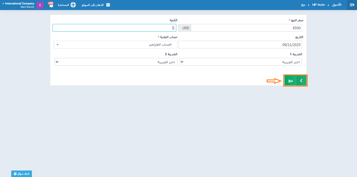 في حال كان لديك أصل ترغب في بيعه، يمكنك توثيق عملية البيع بشكل منظم من خلال إنشاء فاتورة مبيعات مرتبطة بهذه العملية، مما يسهّل تسجيل الإيرادات ومتابعة حركة الأصول بدقة داخل النظام.