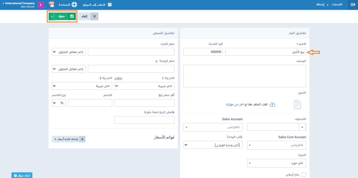 الخطوة التالية تتمثل في إنشاء خدمة جديدة داخل النظام تحت اسم “بيع الأصل“، والتي ستُستخدم لاحقًا لإدراجها في فاتورة المبيعات الخاصة بعملية البيع.