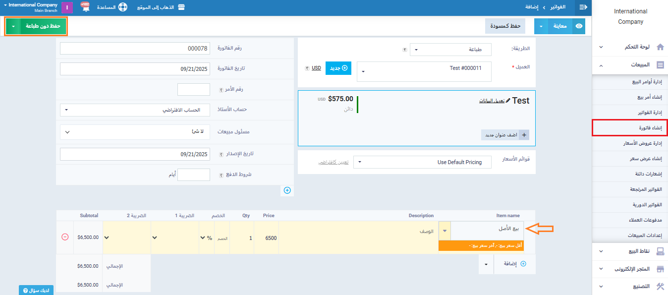 إنشاء فاتورة مبيعات عند بيع الأصل