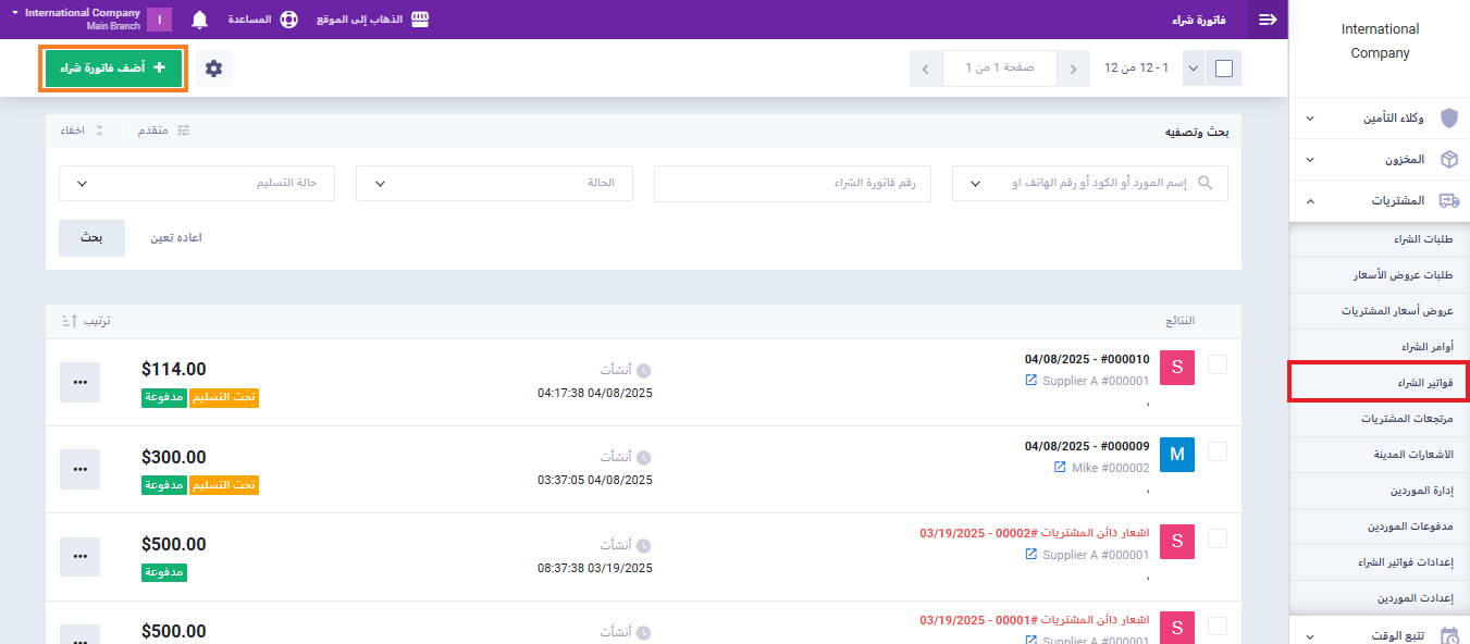 من القائمة الرئيسية، انتقل إلى “المشتريات“، ثم اختر “فواتير الشراء“، واضغط على زر “أضف فاتورة شراء” لبدء إنشاء فاتورة جديدة.