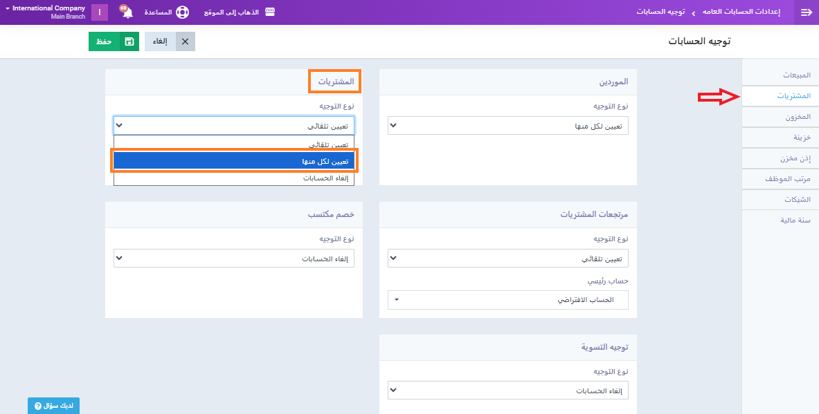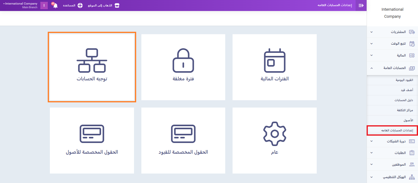 من القائمة الرئيسية اضغط على “المحاسبة“, ومن القائمة المنسدلة اضغط “إعدادات الحسابات العامة“, ثم اختر “توجيه الحسابات“.