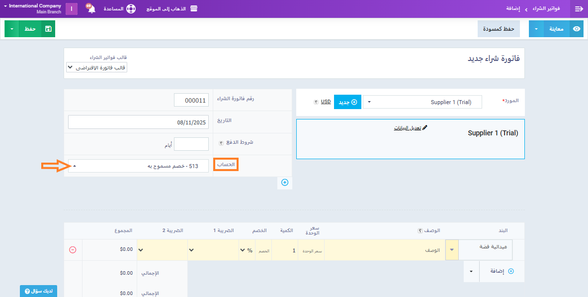 إنشاء فاتورة مشتريات وتوجيهها الي حساب مصروف معين