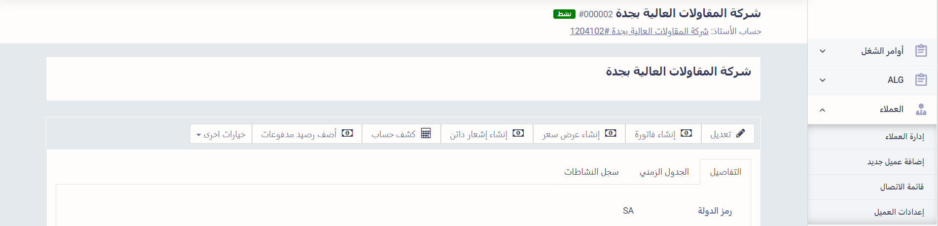 اضغط على “إضافة عميل جديد” المنسدلة عن “العملاء” بالقائمة الرئيسية وأضف العميل “شركة المقاولات العالية بجدة”.