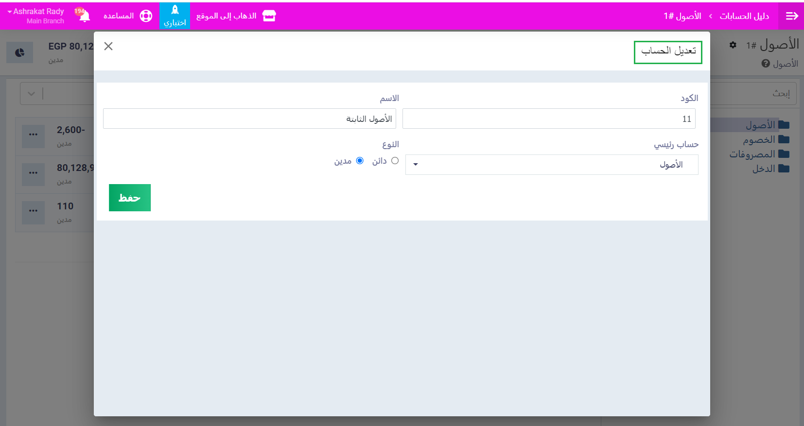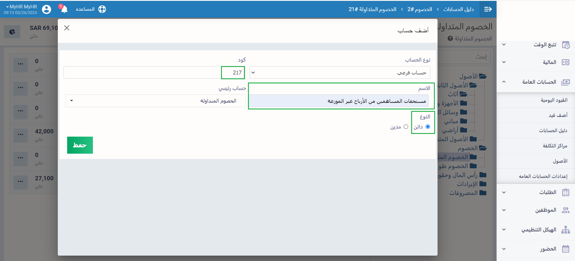 • النوع: حدد نوع الحساب من حيث طبيعته “دائن” أو “مدين”.
