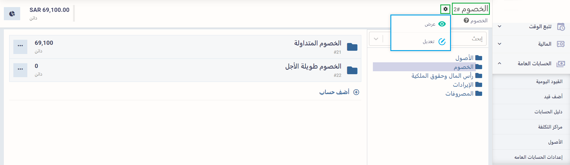 يمكنك عرض أو تعديل الحسابات الأساسية الخمسة، وذلك بالضغط على علامة الإعدادات (⚙️) بجوار اسم الحساب الرئيسي.