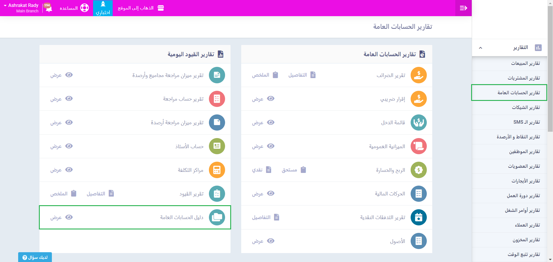 ولاستعراض تقرير شامل عن مجمل حسابات الدليل، اضغط على “تقارير الحسابات العامة” المنسدلة عن “التقارير” بالقائمة الرئيسية ثم اضغط على “دليل الحسابات العامة”.