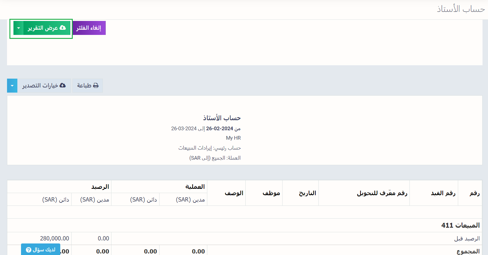 يمكنك استعراض تقرير دليل الحسابات كله أو أحد الحسابات داخله فقط، لاستعراض تقرير أحد الحسابات، افتح هذا الحساب في شجرة الحسابات ثم اضغط على أيقونة التقارير في الأعلى.