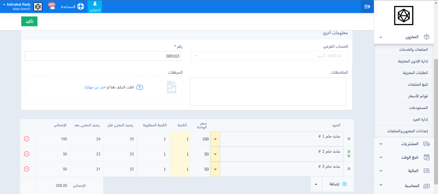 تجد شاشة إذن استلام الخامات، قم بالتعديل والضبط كما أسلفنا الذكر في الفقرات السابقة، وبعد الإنتهاء اضغط على زر “تأكيد”.