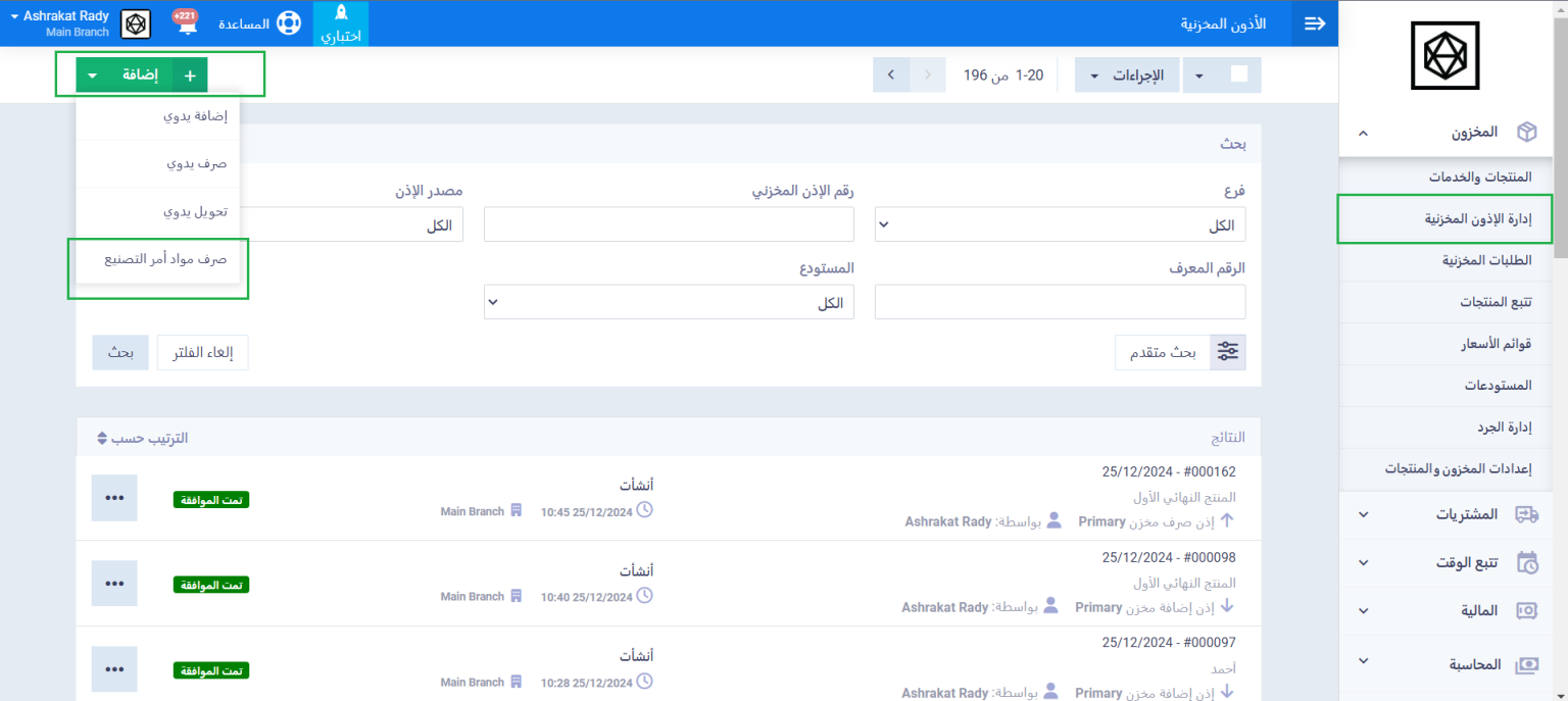 بالإضافة إلى استلام الخامات من داخل أمر التصنيع، يمكنك استلامها من خلال شاشة الأذون المخزنية. وذلك بالضغط على “إدارة الأذون المخزنية” المنسدلة عن “المخزون” بالقائمة الرئيسية ثم الضغط على زر “إضافة” واختر من القائمة المنسدلة “صرف مواد أمر التصنيع”.