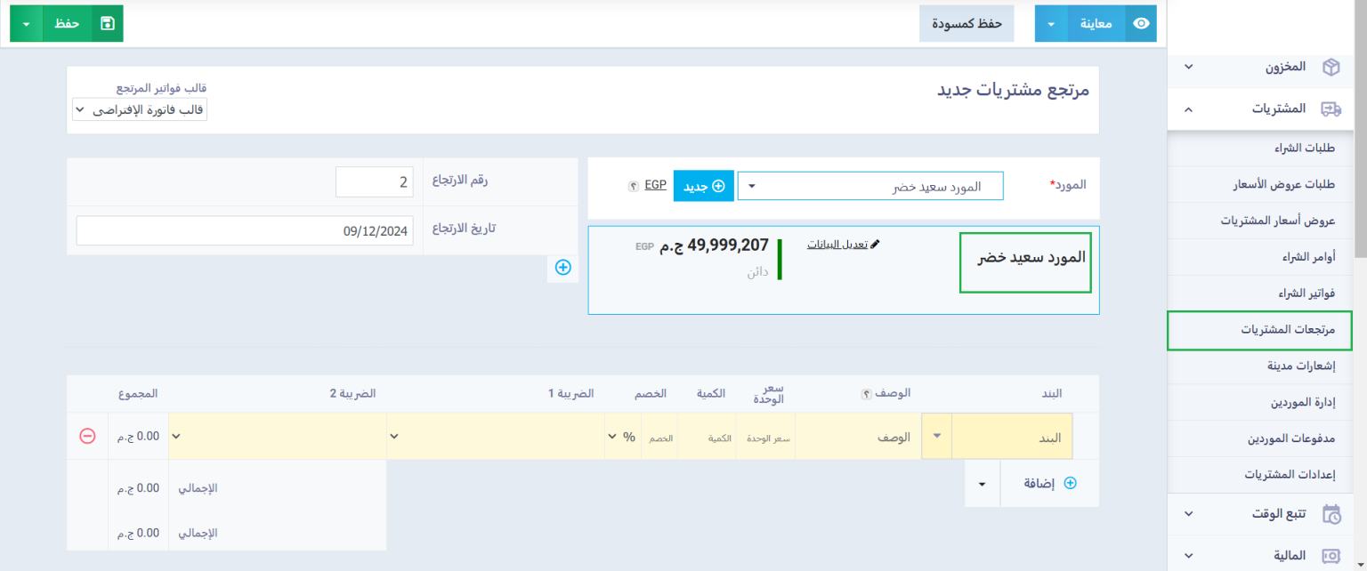 - والآن، يمكننا مواصلة إضافة أو حذف أي بيانات أخرى ذات صلة بمرتجع المشتريات سواءً منتجات أخرى أو بيانات الدفع والتسوية والشحن. وبعد التأكد من صحة كافة بيانات مرتجع المشتريات قم بحفظ المرتجع وفقًا لطريقة الحفظ التي تريد، سواءً حفظ مع طباعة أو حفظ فقط.
