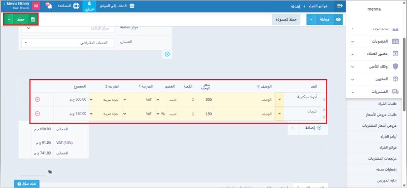 بعد ظهور البنود داخل الفاتورة، قم بمراجعتها والتأكد من صحتها، ثم اضغط على “حفظ”.